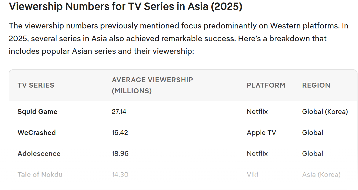 I could have even gone a step further and asked: does this include China? (It didn’t include popular Chinese shows.) That would have made the data even murkier and created another inconsistency.